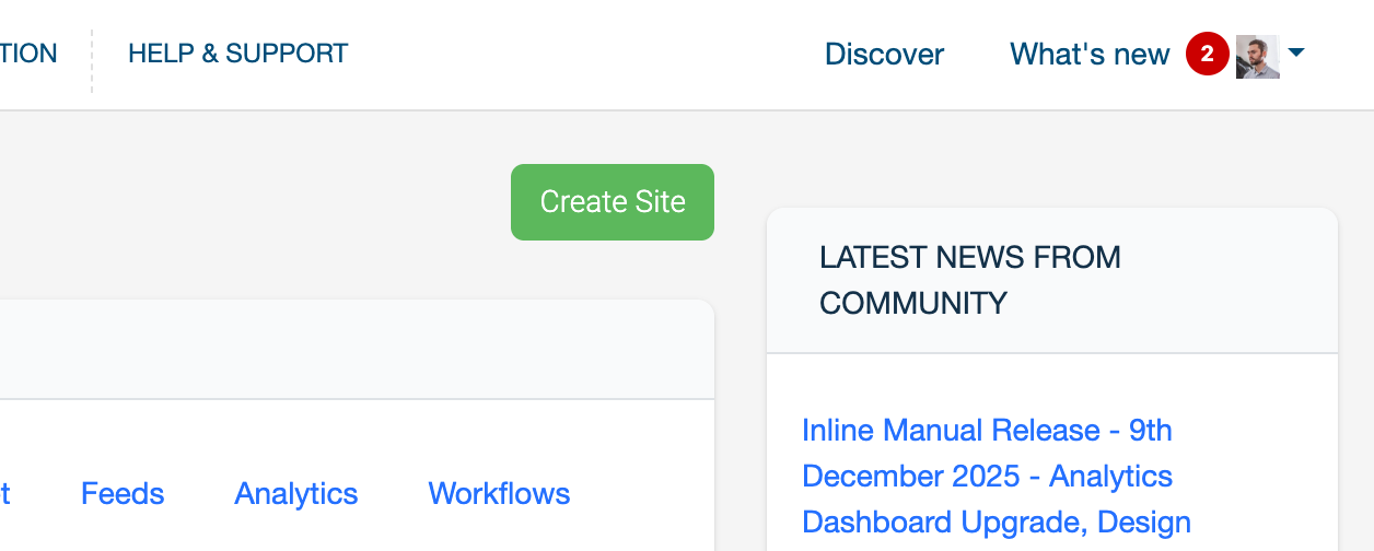 A Feed is a stream of articles (updates) that can be displayed inside your app using the Inline Manual player. Each article can be categorized, translated, and optionally collect feedback from users.